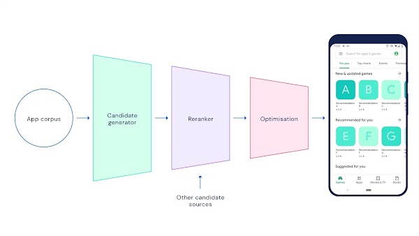 We started collaborating with the Play store to help develop and improve systems that determine the relevance of an app with respect to the user. In this post, we’ll explore some of the cutting-edge machine learning techniques we developed to achieve this. Today, Google Play’s recommendation system contains three main models: a candidate generator, a reranker, and a model to optimise for multiple objectives. The candidate generator is a deep retrieval model that can analyse more than a million apps and retrieve the most suitable ones. For each app, a reranker, i.e. a user preference model, predicts the user's preferences along multiple dimensions. Next these predictions are the input to a multi-objective optimisation model whose solution gives the most suitable candidates to the user.