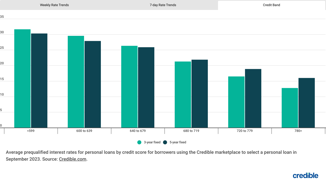 The chart above presents average prequalified rates for borrowers with credit scores of 720 or higher who used the Credible marketplace to choose a personal loan lender. Today’s personal loan interest rates may differ for borrowers with lower credit scores.