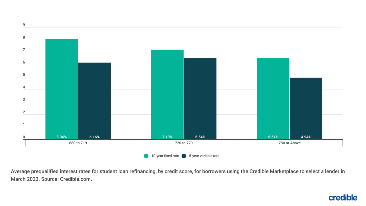 The student loan refinancing rate you receive, if you qualify, depends on several factors, including your FICO score and whether you choose a fixed- or variable-rate loan.