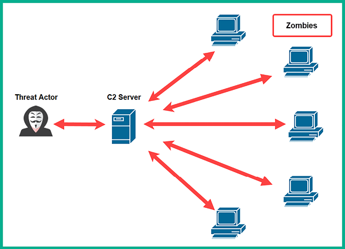 An important stage in a cyber-attack is creating C2 communication channels between the compromised systems and a C2 server on the internet. This allows the threat actor to centrally control a group of infected systems (zombies) in a collection of a botnet using a C2 server that is managed by the adversary. This allows the threat actor to create an army of zombies, all controlled and managed by a single threat actor. The following diagram shows an example of C2: