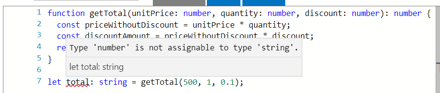 The type information helps the TypeScript compiler catch bugs and typos before our users run into them. In code editors such as Visual Studio Code, a mistake is underlined in red immediately after the user has gone wrong. As an example, create a file called utils.js and paste in the following code, which calculates the total price on an order line: